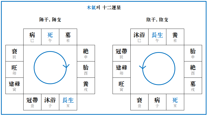 庚일생은 寅에서 胞가 시작하고, 壬일과 戊일생은 巳에서 胞가 시작, 甲일생은 申에서 포가 시작하고, 丙일생은 亥에서 포가 시작한다는 뜻으로 모두 陽干에 해당하며, 순서는 순행방향 즉 시계 방향으로 회전하게 된다. 辛일생은 卯에서 포가 시작하고, 癸일과 己일생은 午에서 포가 시작, 乙일생은 酉에서 포가 시작하고, 丁일생은 子에서 포가 시작한다는 의미이며, 모두 陰干으로 순서는 역행방향 즉 시계반대 방향으로 회전하게 된다. 학자에 따라서는 음양을 구별하지 않는 분들도 있다고 한다. 하지만, 오행으로 봤을 때는 그럴 수도 있겠으나, 엄연하게 음양을 구분할 수 있는 간지의 경우 명확하게 음양을 구분해서 사용해야 맞는 것이 아닐까 싶다.