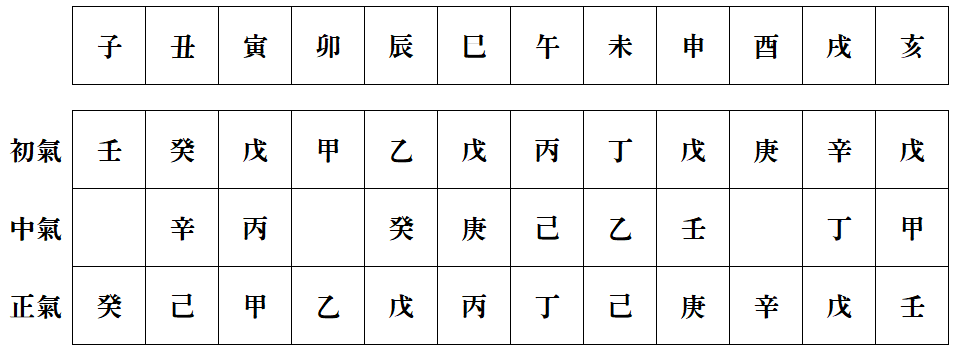 지장간이 각 월별로 배분되어 있는 시간을 보여준다. 지장간은 지지에 암장되어 있는 천간의 기운을 나타내는데(<- 이렇게만 표현하면 엄청 간단한데, 왜 이렇게 되어 있는가를 설명하자면 책 여러 권 나올 듯... 아직 내 책을 쓸 실력까지는 안 되고 흠흠), 자월의 경우 임의 기운이 10일 3분 동안 있은 다음, 계의 기운이 20일 2분으로 차지하게 된다는 의미이다. 가로 배열로 지장간만 다시 보면 다음과 같다.
